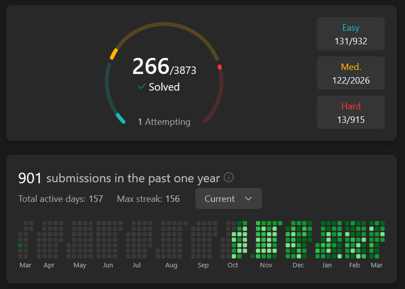 I started my journey in October 2025, and I have since practiced daily without missing a day. So far I solved more than 260 different problems.